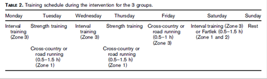 PS: 如果初阶训练者、无法执行像是此实验选手的训练(一周2-3次间歇+ 2次重量训练,并且在重量训练后的隔天安排间歇训练可能因为肌力训练造成身体的酸痛疲劳无法执行有强度的跑步)那么可以改为这样的方式,例如星期二进行重量训练后,隔天安排轻松跑不会因为重训后的疲劳让你无法跑课表,星期四再排有强度的训练、星期五则是重量训练(一周2次)