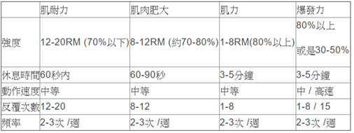 以下表格是几个训练目的的训练变项(但是 !! 这只是参考的数值,详细的内容会因为 训练的肌群、训练的背景、训练的周期…..可能有所调整和差异)