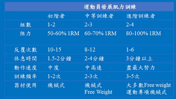 以下这张图,帮助各位发展肌力训练,初阶、中阶、进阶,不同的训练程度,有其建议的方式,虽然我们刚才一直强度高强度(大重量)来训练肌力,但如果你是一个刚接触的初阶者先使用比较轻的重量、并且放慢执行的速度和使用稍微多一点的反覆次数10-15,然后用机械式的重量训练器材,这样也是可以的(学习技巧、姿势,并且让肌肉适应重量训练的感觉),等到4周左右,这些都渐渐有所进步,那么就可是开始逐渐进阶了!进阶者通常会使用 Free Weight的器材 (自由重量器材 :就是哑铃、杠铃等)