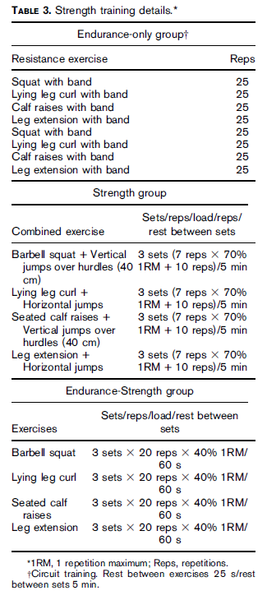 接下来直接拿其中一篇比较不同强度的重量训练对于跑者 (此篇选用的受试者都是最大摄氧量65ml/kg/min以上的菁英选手哦!!) 运动表现影响的研究来做说明: 这篇研究进行了三个不同组别的训练(控制组、肌力组、肌肉耐力组) 控制组用轻的弹力带做训练;肌力组70%的最大肌力;肌耐力组则是40%的最大肌力。